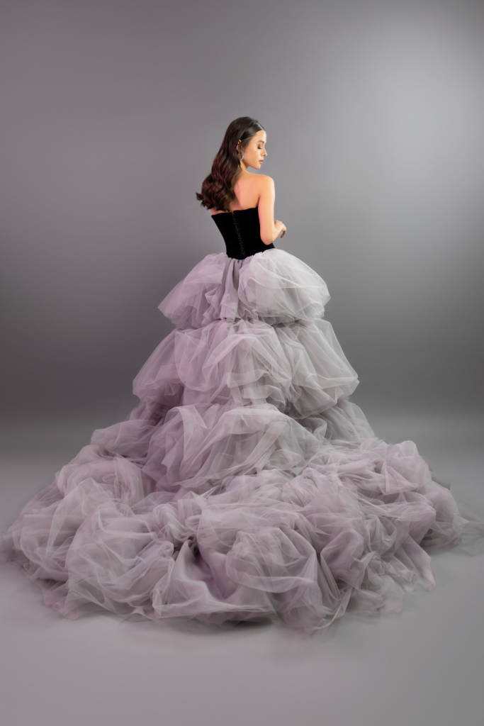Cada una de sus prendas muestran la delicadeza y el lujo que combinan la autenticidad y la individualidad. Aunque sus diseños están marcados por una estética refinada, logra mantener siempre la esencia de su cliente, destacando su estilo personal en cada pieza.